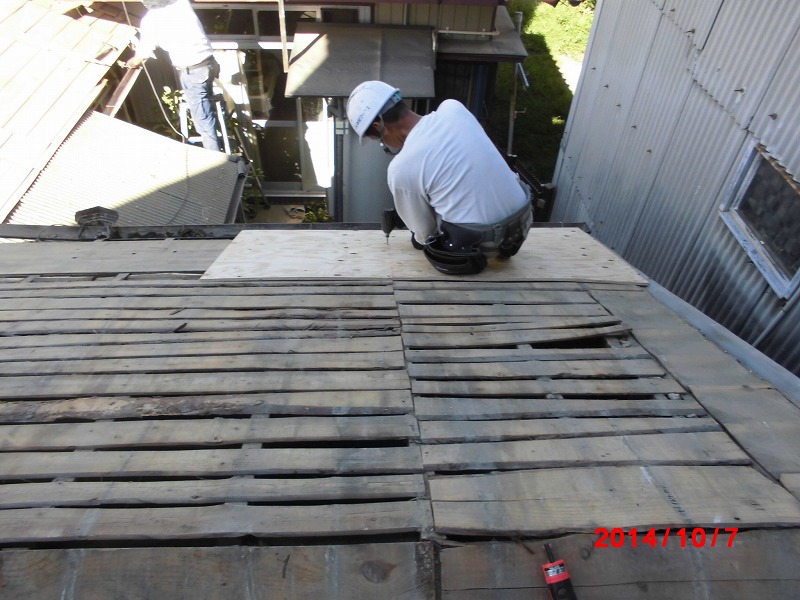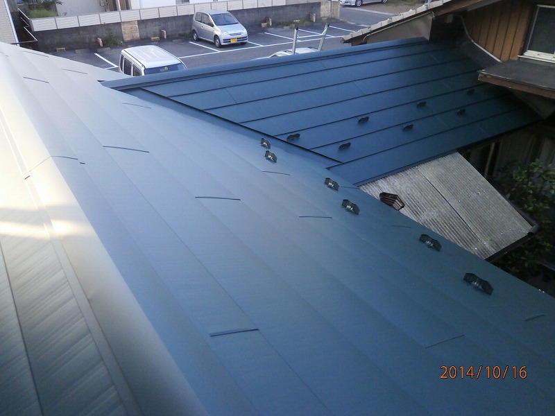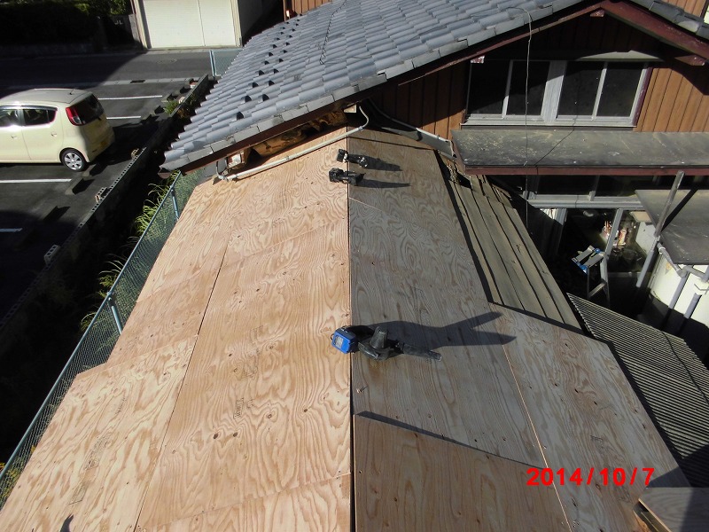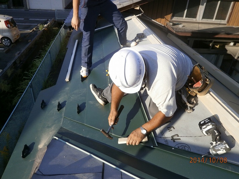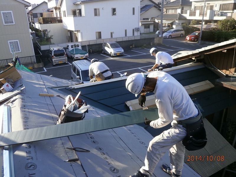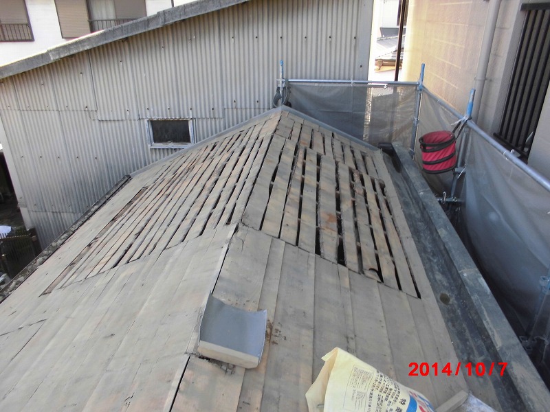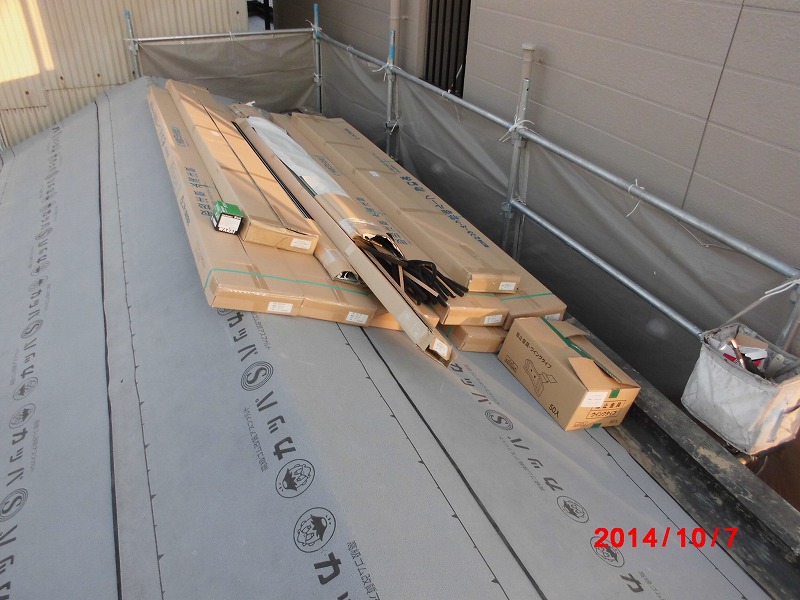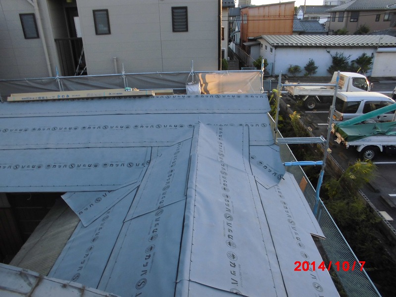 屋根葺き替え工事:仮設 仮設足場架け払い・シート養生【1式】 屋根 既設瓦撤去処分費【51.0平方メートル】 下地コンパネ大工工事【51.0平方メートル】 ゴムアスルーフィング【51.0平方メートル】 横暖ルーフ きわみ【51.0平方メートル】 棟(下地込み)【13.5メートル】 谷樋【1式】 軒樋架け替え【11.0メートル】 集水器【5ヶ所】
