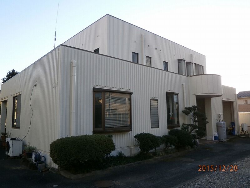 外壁工事:仮設足場架け払い・シート養生【445.0平方メートル】 外壁(東1階・北面1階・南西前面) 高圧洗浄・下塗りフィラー・中塗りシリコン・上塗りシリコン【218.2平方メートル】 外壁(東南2階、北面2階)下地胴縁大工工事【56.2平方メートル】 GL鋼板角波4山2型【56.2平方メートル】 土台水切り、出隅・入隅【28.9平方メートル】 開口部見切り【32.4平方メートル】 コーキング:コーキング増し打ち補修【1式】 雑部:入口軒天張替え大工工事【1式】 軒天ケンエース2回塗り【29.4平方メートル】 たて樋ウレタン2回塗り【23.5平方メートル】 東面室外機撤去処分【1式】 防水改修工事2階屋根【106平方メートル】1階屋根【100平方メートル】 既存ゴムシート撤去及び廃材処理・下地処理・ゴムシート防水【206.0平方メートル】 改修用ドレン取付【4セット】 端末金物取付(シール共)【93.0メートル】