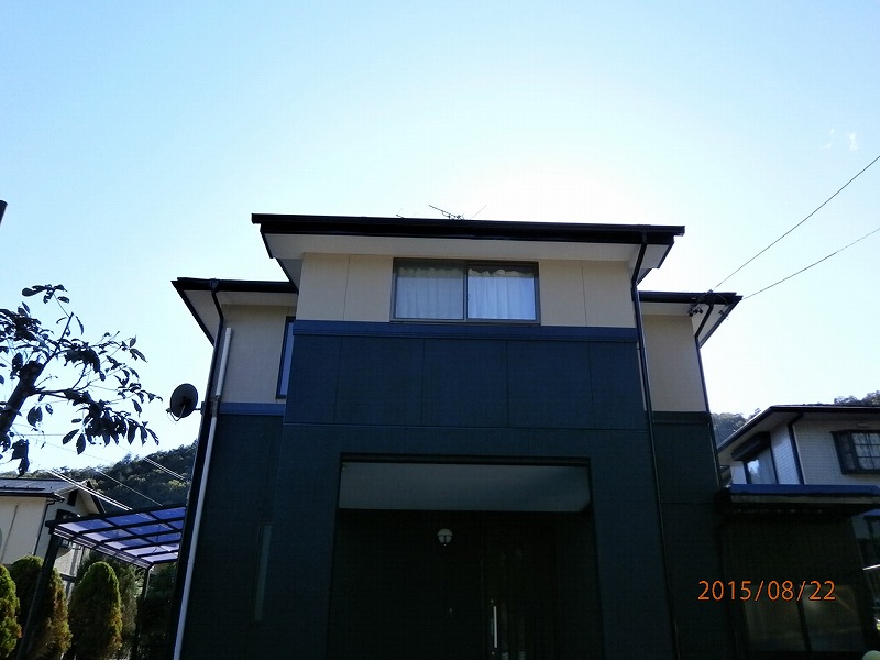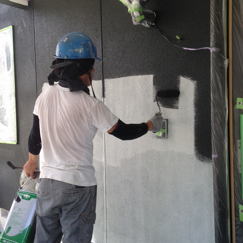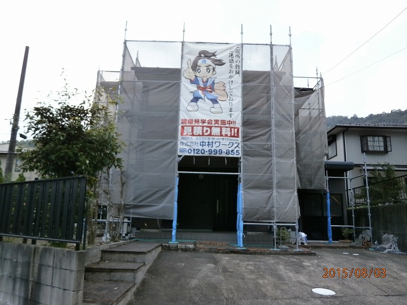 屋根外壁塗装工事:仮設足場架け払い・シート養生【286.0平方メートル】 屋根:高圧洗浄・下塗りシーラー・中塗りアドグリーン塗装・上塗りアドグリーン塗装【95.1平方メートル】 外壁:高圧洗浄・下塗りフィラー・中塗りシリコン・上塗りシリコン【118.7平方メートル】 トタン部:ケレン【28.9平方メートル】 下塗りサビ止め・中塗りシリコン・上塗りシリコン【28.9平方メートル】 雑部:軒天ケンエース2回塗り【20.2平方メートル】 鼻隠しウレタン2回塗り【17.0メートル】 破風板ウレタン2回塗り【7.0メートル】 軒樋ウレタン2回塗り【17.0メートル】 縦樋ウレタン2回塗り【34.0メートル】 帯部ウレタン2回塗り【35.0メートル】 雨戸 大2・小2【1式】 既設コーキングカット(継部)【1式】 コーキング打設(継部・窓廻り)【115.8メートル】