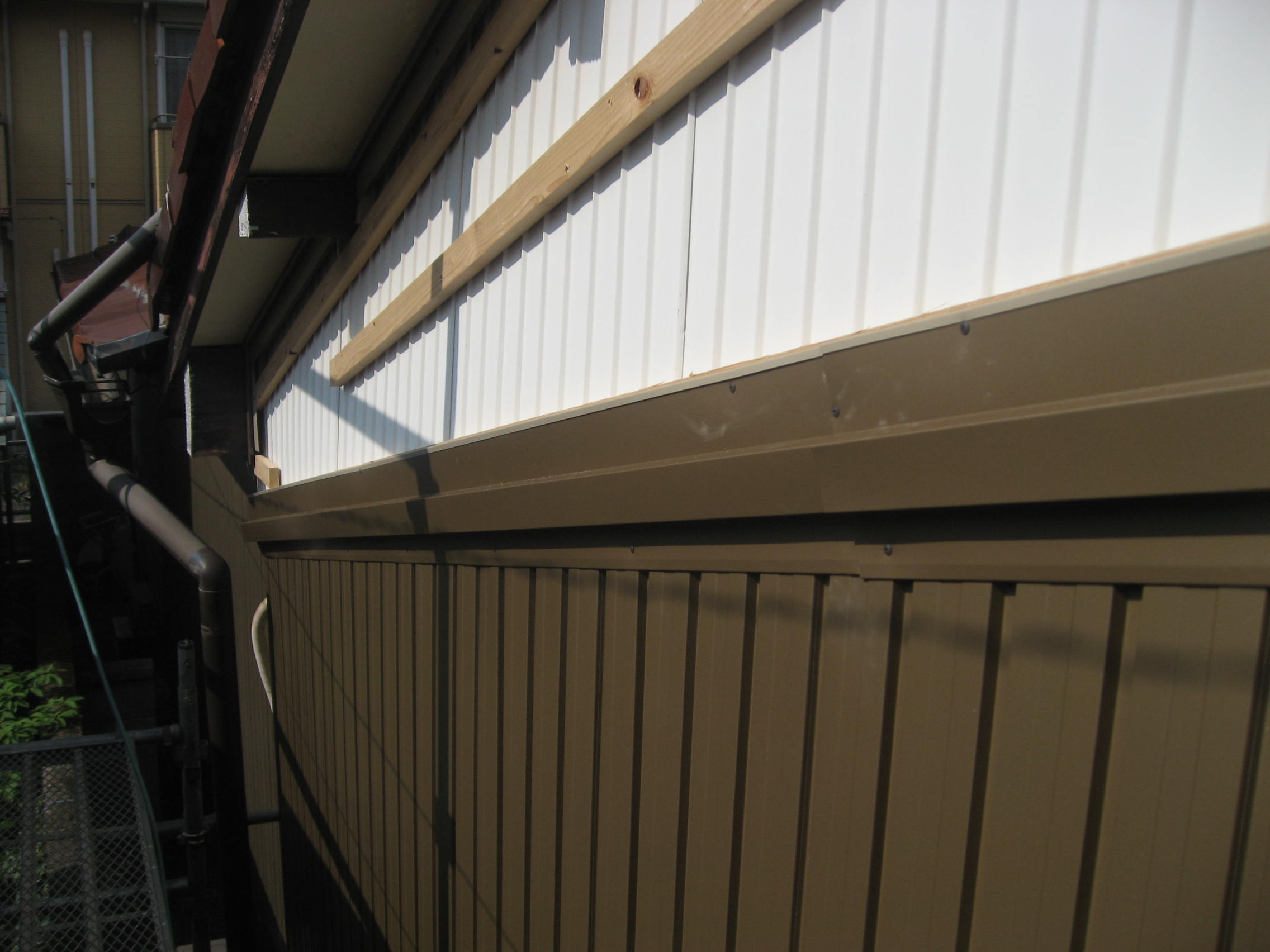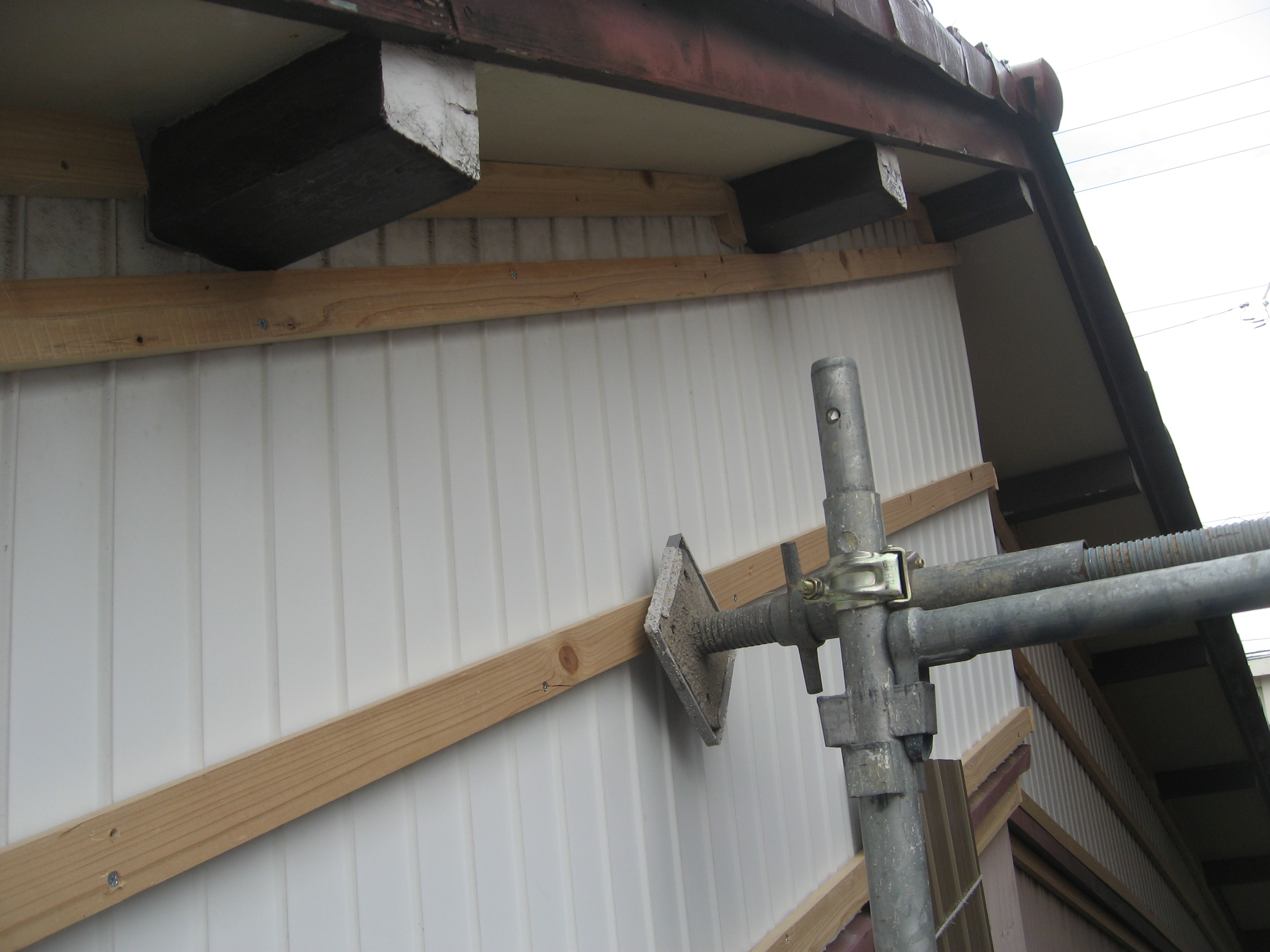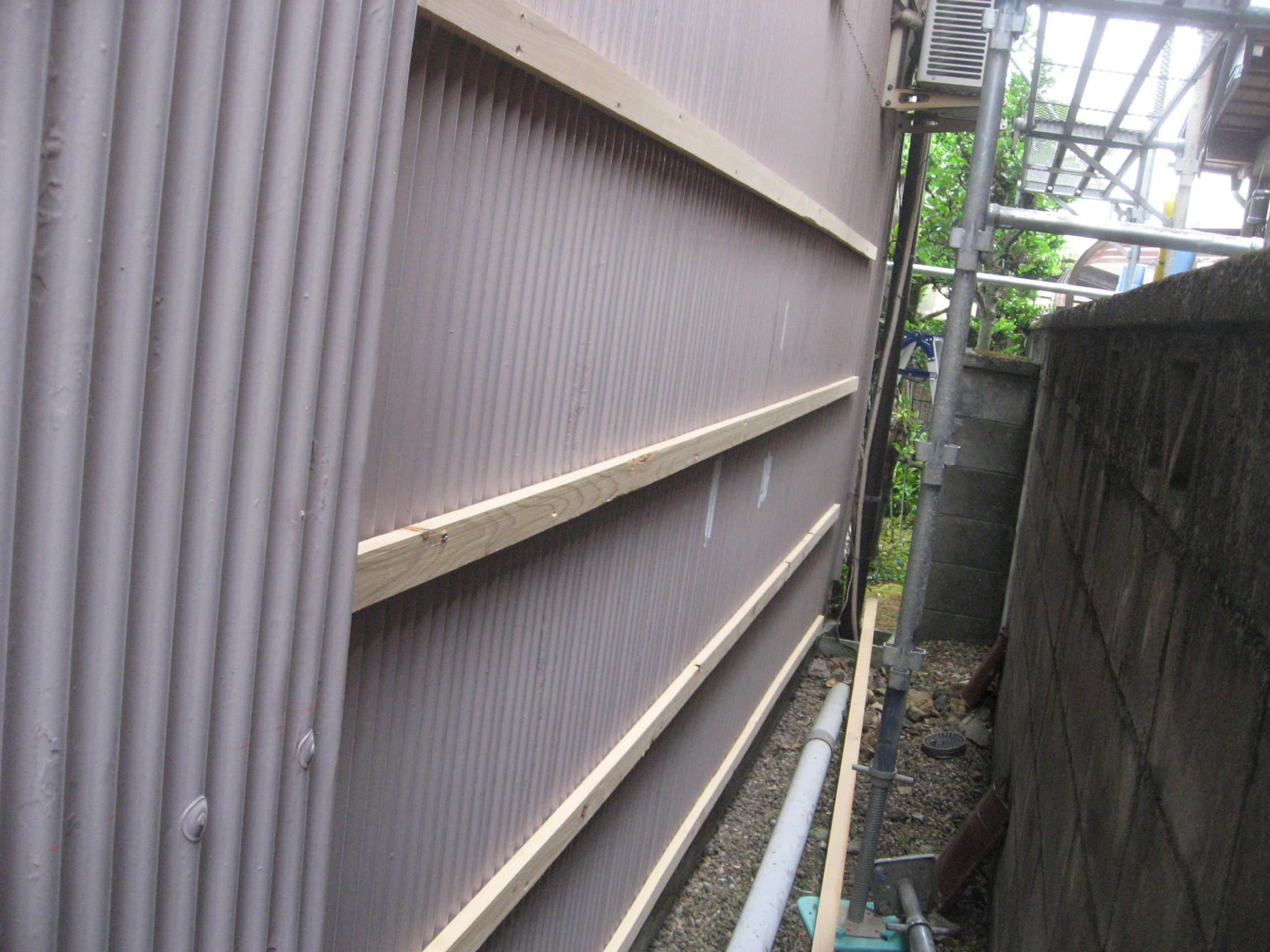 外壁トタン工事 西面(南):仮設足場架け払い【1式】 下地胴縁大工工事【36.0?】 角波ガルバリウム鋼板貼り【36.0?】 樋脱着【1式】 増築(東):既設トタンめくり、処分【4.5?】 角波ガルバリウム鋼板貼り【4.5?】 西面(北):外壁トタン下部役物【5.0m】