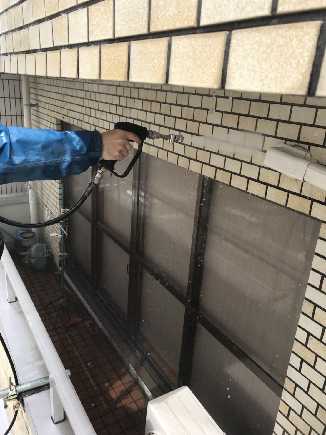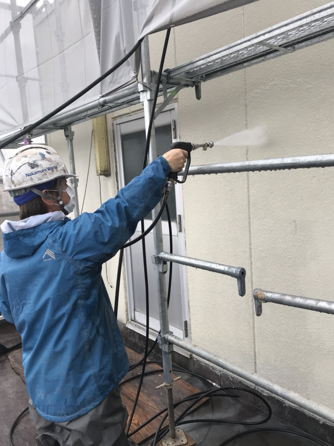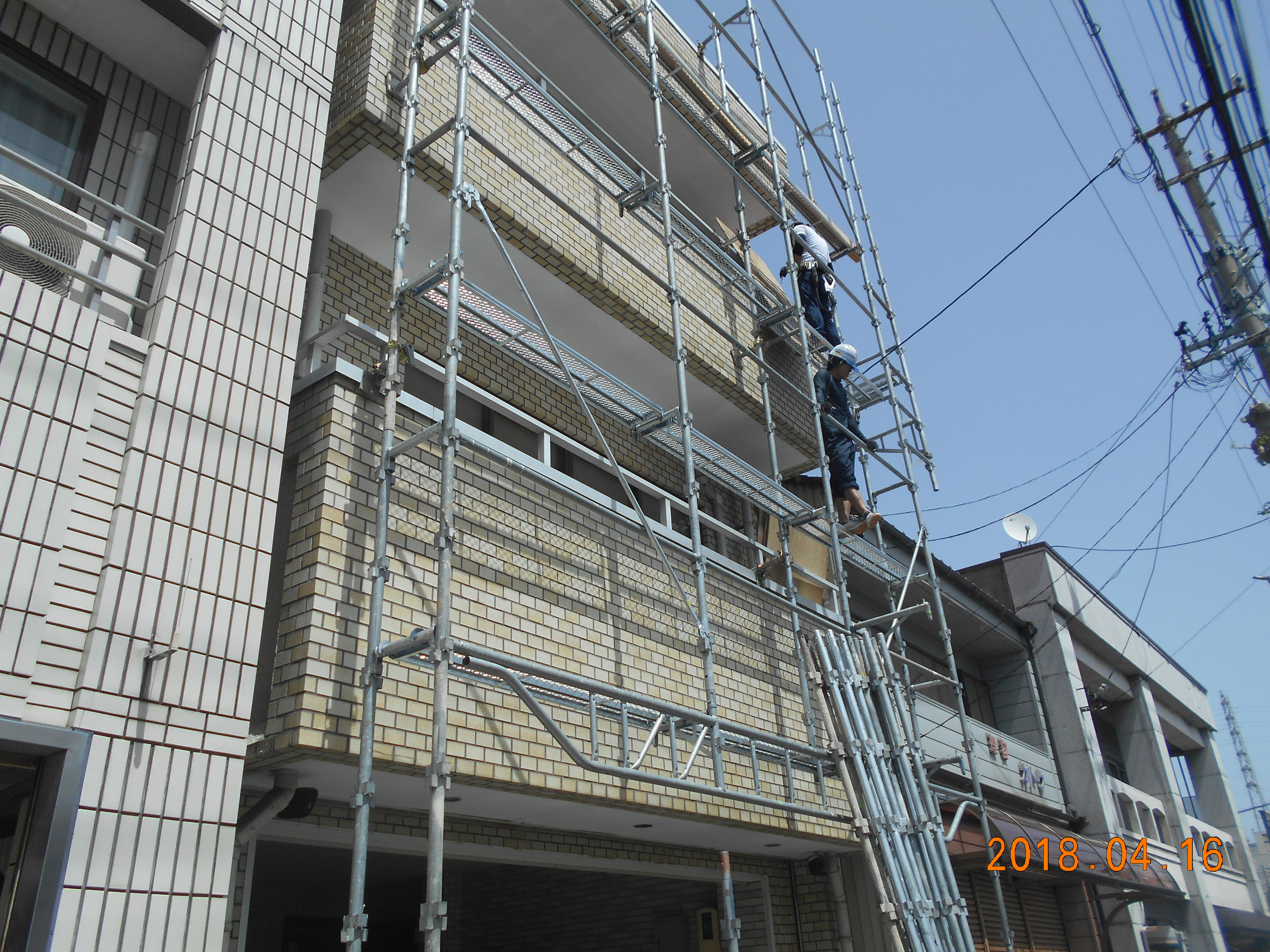 仮設足場架け払い、高圧洗浄、下塗り、中塗り、上塗り、コーキング補修、VU管シリコン塗装、シャッター塗装