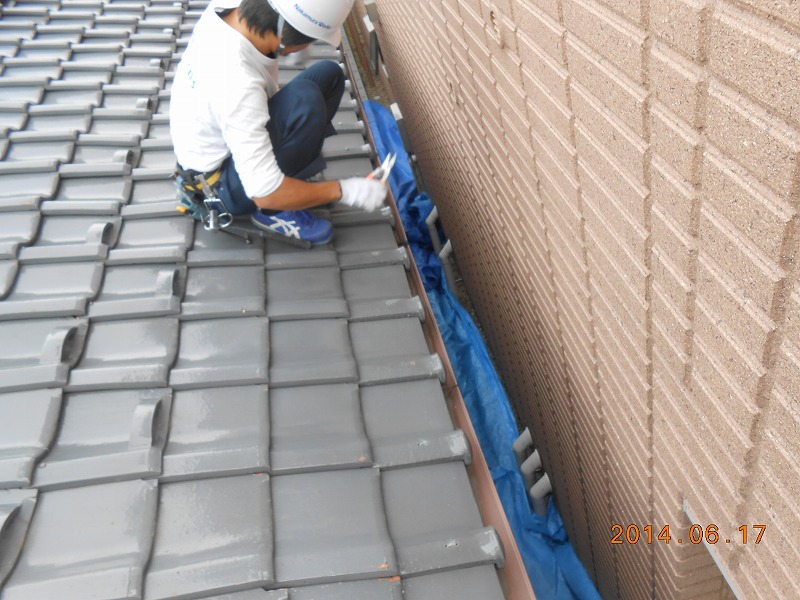 仮設:足場架け払い・養生シートリース(約30平方メートル) 解体:瓦めくり撤去処分(土含む) 鼻先部木部解体撤去処分 雨樋解体撤去処分 小庇:解体撤去処分 大工:瓦下地 破風加工 鼻隠し新設軒天 瓦:鼻先瓦葺き戻し 板金:小庇撤去部板金補修(約8平方メートル) 樋:軒樋半丸105 金具込み8.6m 集水器