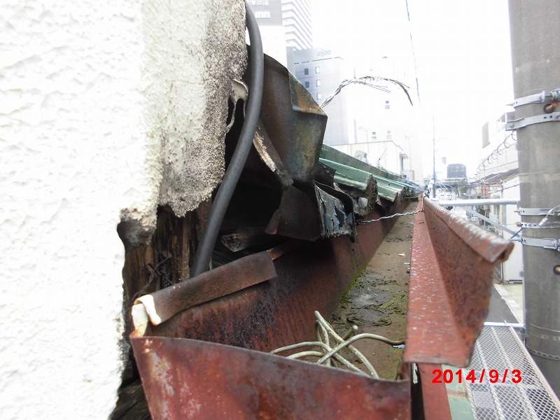 屋根板金工事:仮設 足場架け払い【約70平方メートル 1式】 大工 屋根木下地 垂木、コンパネ使用【33.9平方メートル】 板金 ルーフィング【33.9平方メートル】 立平葺き【33.9平方メートル】 棟板金【4.7メートル】 北側箱樋【4.7メートル】 軒樋【4.0メートル】 集水器【1ヶ】 西側立上げ部角波板金張り【6.5平方メートル】 西側立上げ部笠木板金【6.3メートル】