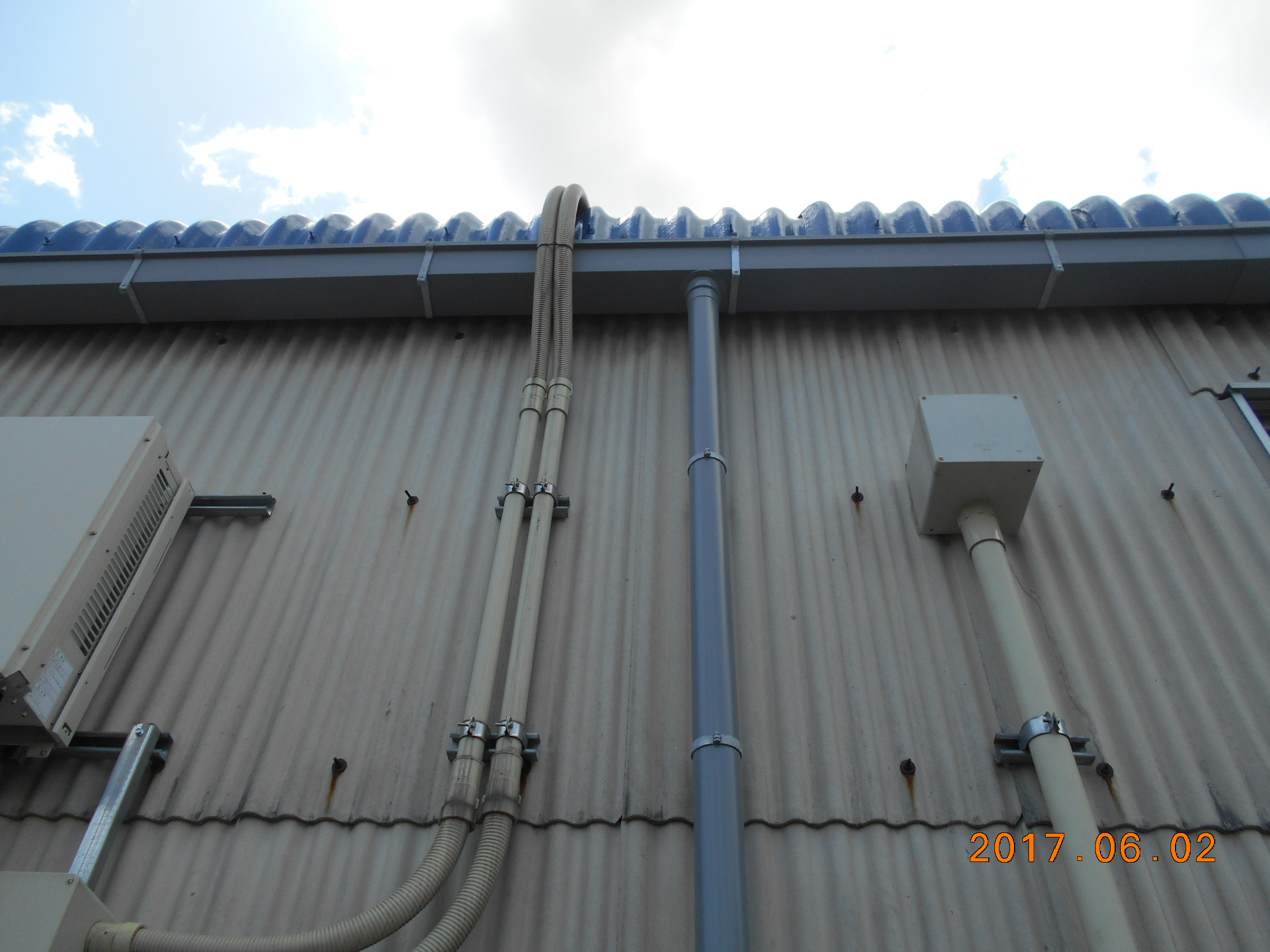 仮設足場架け払い290?・高圧洗浄185?・下塗りフィラー・中塗り遮熱防水防カビ塗装・上塗りアステック5600PCM IR+S・鼻隠しシリコン塗装34.2m・破風シリコン塗装39.6m・軒天ケンエース2回塗り44.2?・シャッターボックス4箇所・軒樋シリコン塗り日本ペイント50m・たて樋シリコン塗り日本ペイント34.2m・帯シリコン2回塗り日本ペイント21.7m サッシ・1F(南)掃出し窓3箇所吹付塗装・シール:コーキング打ち替え(継部・窓廻り)280m 水切りシリコン2回塗り・軒天と壁取り合い28m・ガラス取替出窓部分1枚・作業場北面ラジカル部分塗装高所作業のタワー12m程 塗装(青)