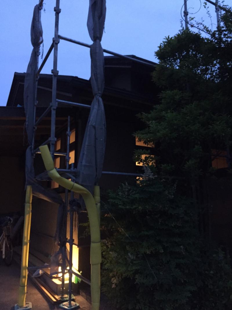 屋根塗装工事 仮設:仮設足場架け払いネット共【1式】 テラス上養生【1式】 屋根:高圧洗浄【254.4?】 下塗りシーラー【254.4?】 中塗りファインUVベスト日本ペイント【254.4?】 上塗りファインUVベスト日本ペイント【254.4?】 木部:ペーパー、ガードラックアクア塗装【1式】 引き戸【6】、戸箱(側面)【20m】、がらり【10?程】、ハナ【60m】、窓【10枚】、格子【2.4×1.2、0.9×0.9×2】 帯【30m】